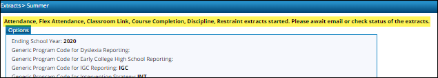 NOTE: You can select to run the Classroom Link and Course Completions extracts individually; however, the program expects the Classroom Link extract to be run first. If you select to extract Course Completion data but do not select to extract Classroom Link data, the program verifies that Classroom Link records exist for the current school year. If they do not exist, a message is displayed and no data is extracted.