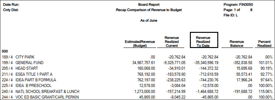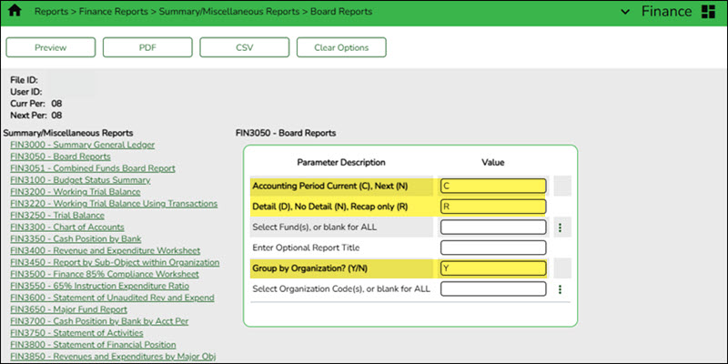 This data can also be verified by using the Finance > Reports > Finance Reports > Summary/Miscellaneous Reports > FIN3050 - Board Report