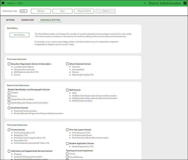 ❏ Added this tab to extract Texas Student Data System (TSDS) data and send it to Texas Education Agency (TEA) for Ed-Fi processing. Users can select and save domains and entities, view the status of extracted data, and initiate on-demand data submissions.