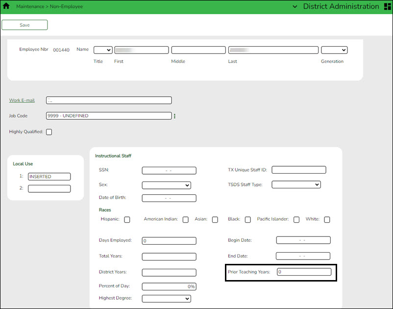 ❏ Added the Prior Teaching Years field to report the total number of years an individual has previously held a teaching position in one or more educational institutions. For TSDS purposes, this information must be reported for Contracted Teachers.