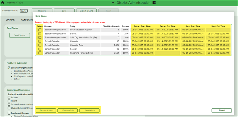 ❏ Modified the Send Status pop-up window to allow those users with the appropriate access to see the new Domain/Entity checkboxes and Time fields, and extract/send individual (previously processed) Domains/Entities as needed.