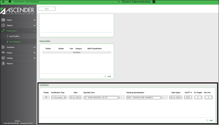 ❏ Added the Certification section with the following fields allowing non-employees to be added with the appropriate certification details for TSDS reporting.
