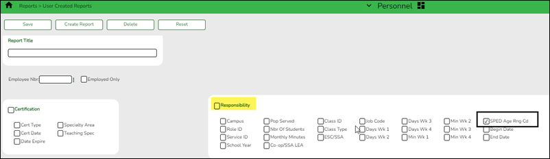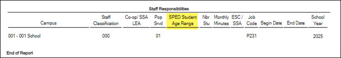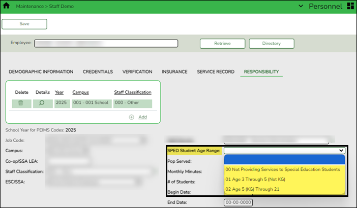 • Added the SPED Student Age Range field to select the code indicating the age range of Special Education students supported by the teacher or paraprofessional staff member. This data will also be included in the Personnel > Utilities > Mass Update > Responsibility process.