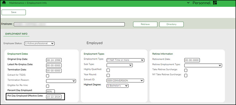 ❏ Added the Pct Day Employed Effective Date field to the Employment Dates section. This field only applies to employees with an Employee Status of 1, 2, 3, 4, 5, or A, and is only enabled when the Percent Day Employed is changed. If the Percent Day Employed is changed, the Pct Day Employed Effective Date is required.