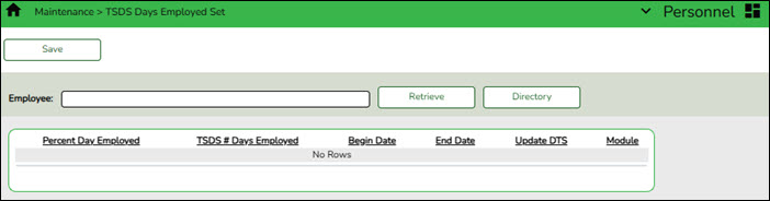 ❏ Added a new page to keep a record of the number of days an employee has been employed for TSDS reporting purposes and manage begin/end dates if corrections are necessary. Each record displays the percent of day employed, the TSDS number of days employed, the begin and end dates, a date timestamp indicating when the record was created, and the module within the system where the update originated.