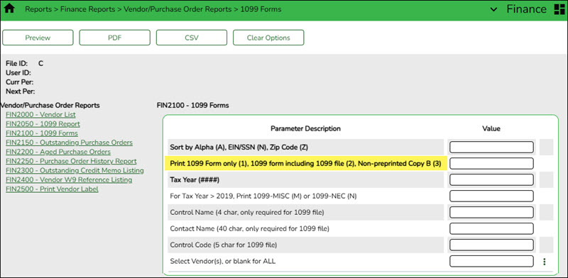 Finance > Reports > Finance Reports > Vendor/Purchase Order Reports > FIN2100 - 1099 Forms