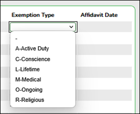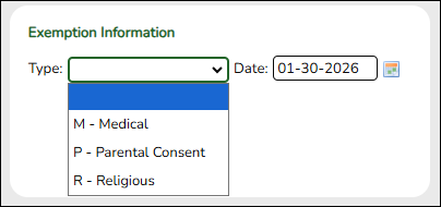 ❏ Updated the Exemption Type drop-down menu to display the following values for sy 2026 and beyond: