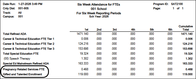 Attendance > Reports > Attendance Reports > Campus > SAT2100 - Six Weeks FTE Report