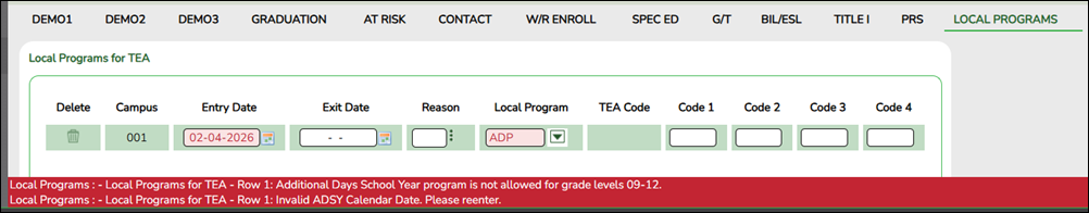 ❏ Modified the page message to Local Programs: - Local Programs for TEA - Row 1: Additional Days School Year program is not allowed for grade levels 09-12.