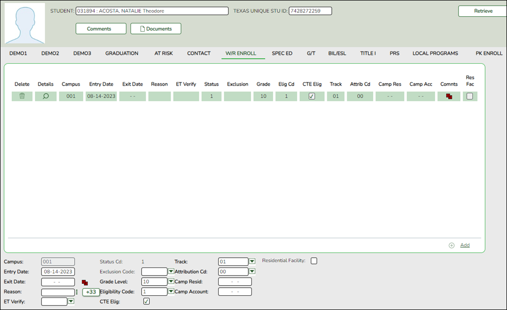 Registration > Maintenance > Student Enrollment > W/R Enroll