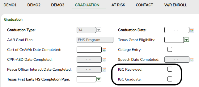 IndividualGraduationCommitteeReview (E1563) - Indicates whether an Individual Graduation Committee (IGC) has been established for a student regardless of which graduation program type is being pursued. This is collected for students in grades 11 and 12.