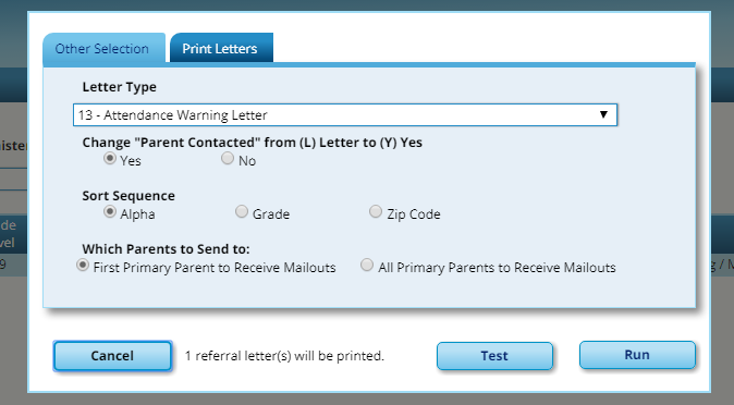 Click Test to print a test page, or click Run to print letters for all selected students. The letter opens in a new window or tab.