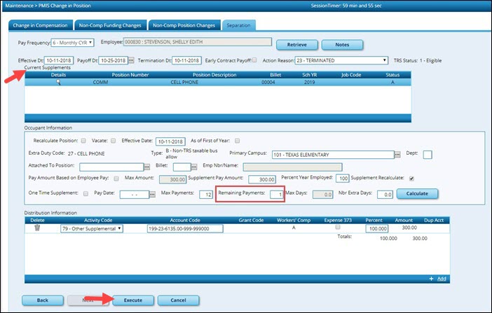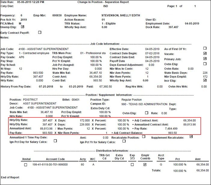 If a supplement position exists, update the number of Remaining Payments and click Execute. The Separation Report is displayed. In addition to the new pay rate, the salary that the employee would have earned if they worked a full year as well as the salary that the employee actually earned if they did not complete the contract year is displayed.