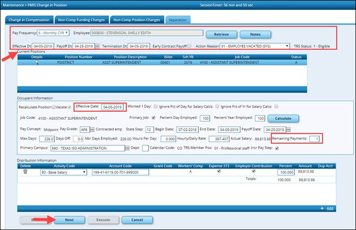 Note: In rare situations, the information calculated in a payoff may include special circumstances making it impossible for the system to perform the calculation. If the separation process is not used, it is important to manually update the position in the current year PMIS if the Staff Job/Pay Data fields were manually updated.