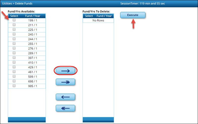 All available fund/year accounts are displayed on the left side of the page. Select the desired fund/year accounts to delete. Use the following buttons to move the selected fund/years to the right side of the page.