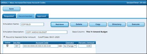 Budget > Utilities > Mass Increase/Decrease Account Codes > Approved