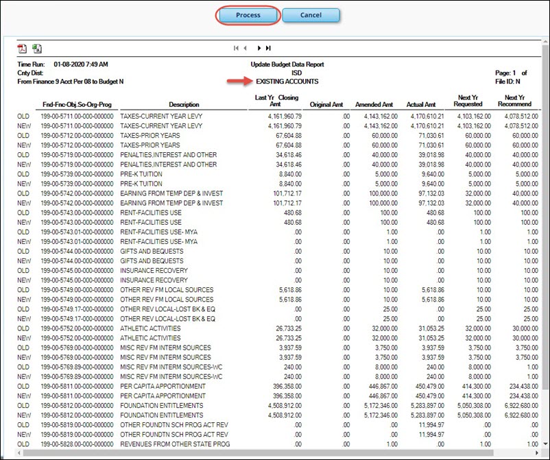 Click Execute to execute the process. The Update Budget Data Report is displayed with the old and new account codes that were updated. Review the report.