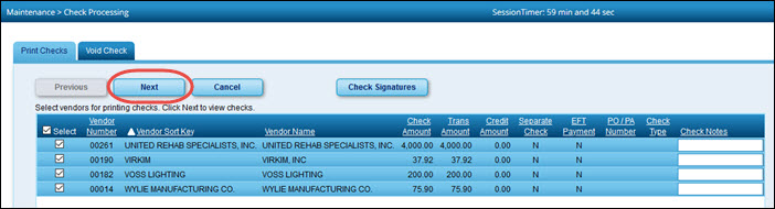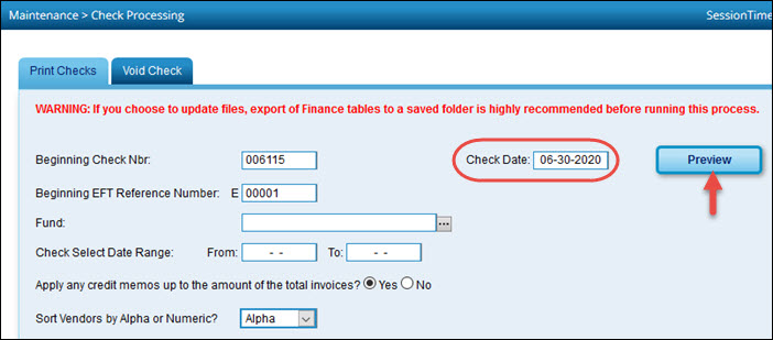 Finance > Maintenance > Check Processing > Print Checks