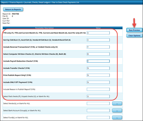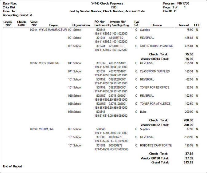 Finance > Reports > Finance Reports > Journals, Checks, Detail Ledgers > FIN1750 - Year to Date Check Payments List