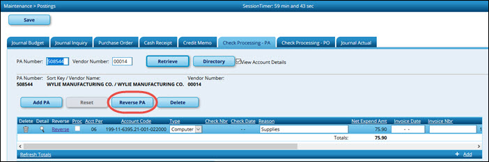 Finance > Maintenance > Postings > Check Processing - PA