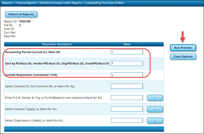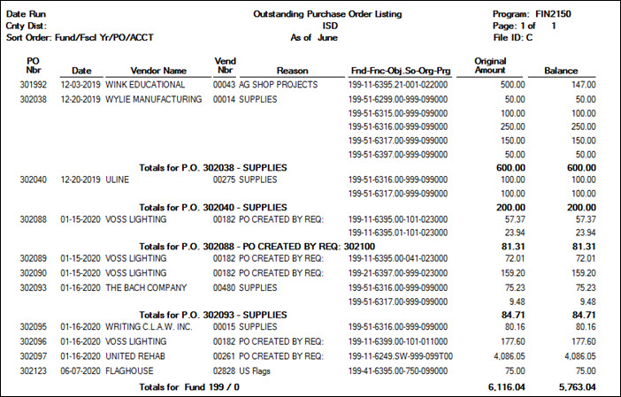 Finance > Reports > Finance Reports > Vendor/Purchase Order Reports > FIN2150 - Outstanding Purchase Orders OR Purchasing > Reports > Purchase Order Reports > REQ1350 - Outstanding Purchase Orders Report