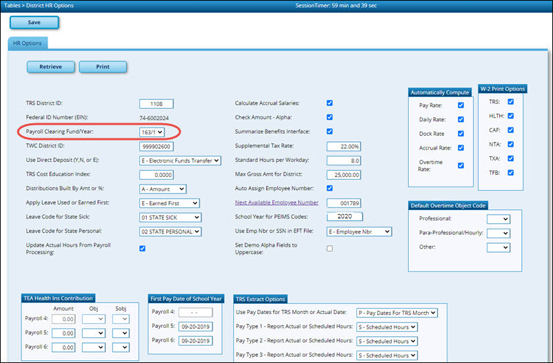 | Payroll Clearing Fund/Year | Select the fund/fiscal year (e.g., 163/9) for the current year to be used as the clearing fund/fiscal year when interfacing to Finance. |