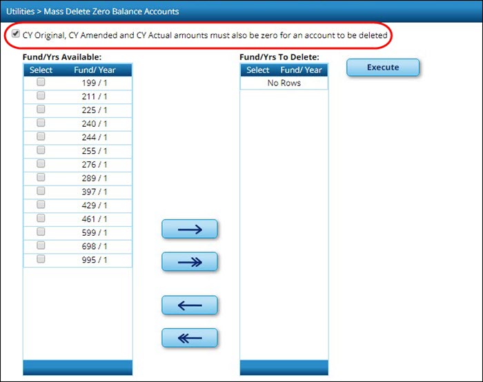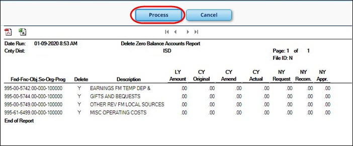 Accounts with a zero amount in the Current Year Original, Current Year Amendment and Current Year Actual columns are deleted.