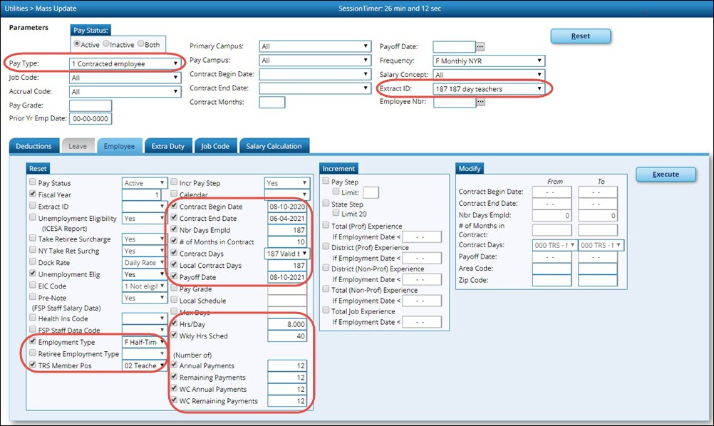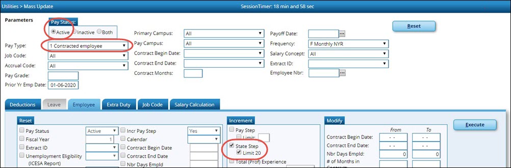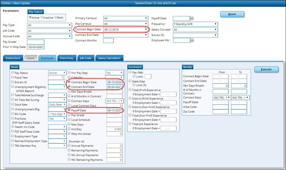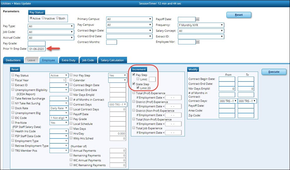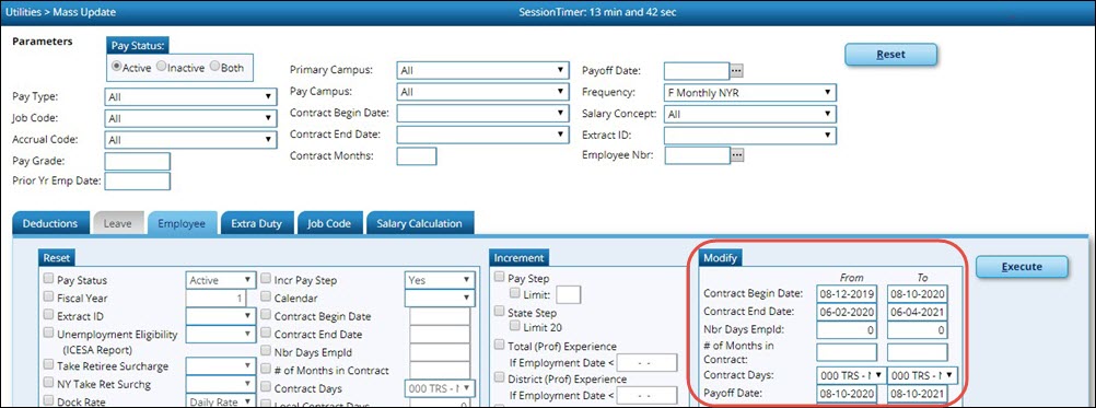 • The first run is to update the contract dates, but not increment any pay steps. Complete only the fields under Modify.