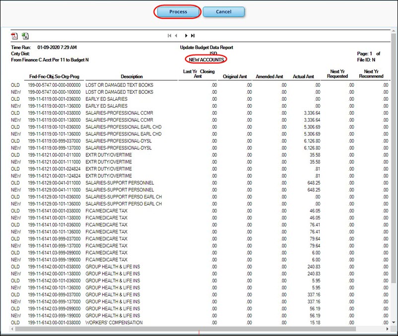 Click Execute to execute the process. The Update Budget Data Report is displayed with the old and new account codes that were updated. Review the report.