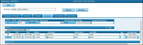 This tab contains insurance information for the employee. The data includes the insurance company, the plan type, coverage information, the individuals covered by the plan, and the demographics of the dependents covered.