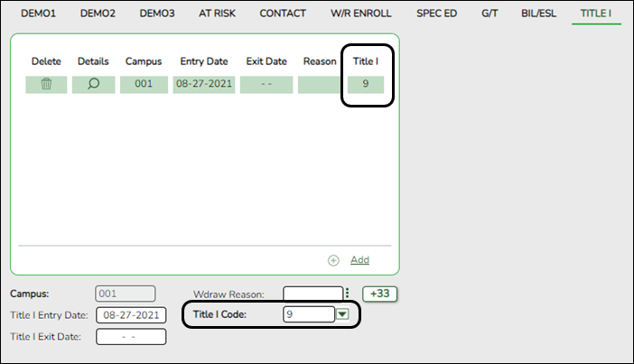 2. In the Title 1 Code field, select 6 Attends Schoolwide Title I Program School.