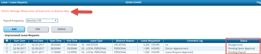 This page is used to create, edit, delete, and submit leave requests for the selected payroll frequency. After a leave request is processed by payroll, it is no longer displayed on this page.