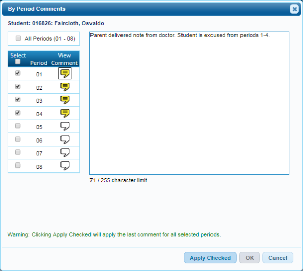 IMPORTANT: If selected, the comment applies to all periods, even if the From/To Period fields are not set to include all periods. For example, if the campus has 8 periods, but the From/To Period fields are set to periods 1-3, the comment will be applied to all 8 periods.