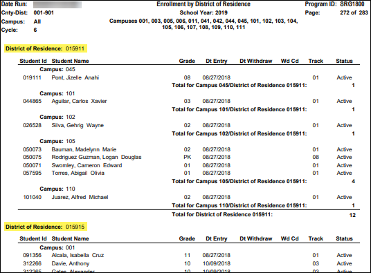 SRG1800 provides a list of students who were enrolled during the selected attendance cycle, grouped by district of residence. Use the report to verify campus ID of residence (CIR).